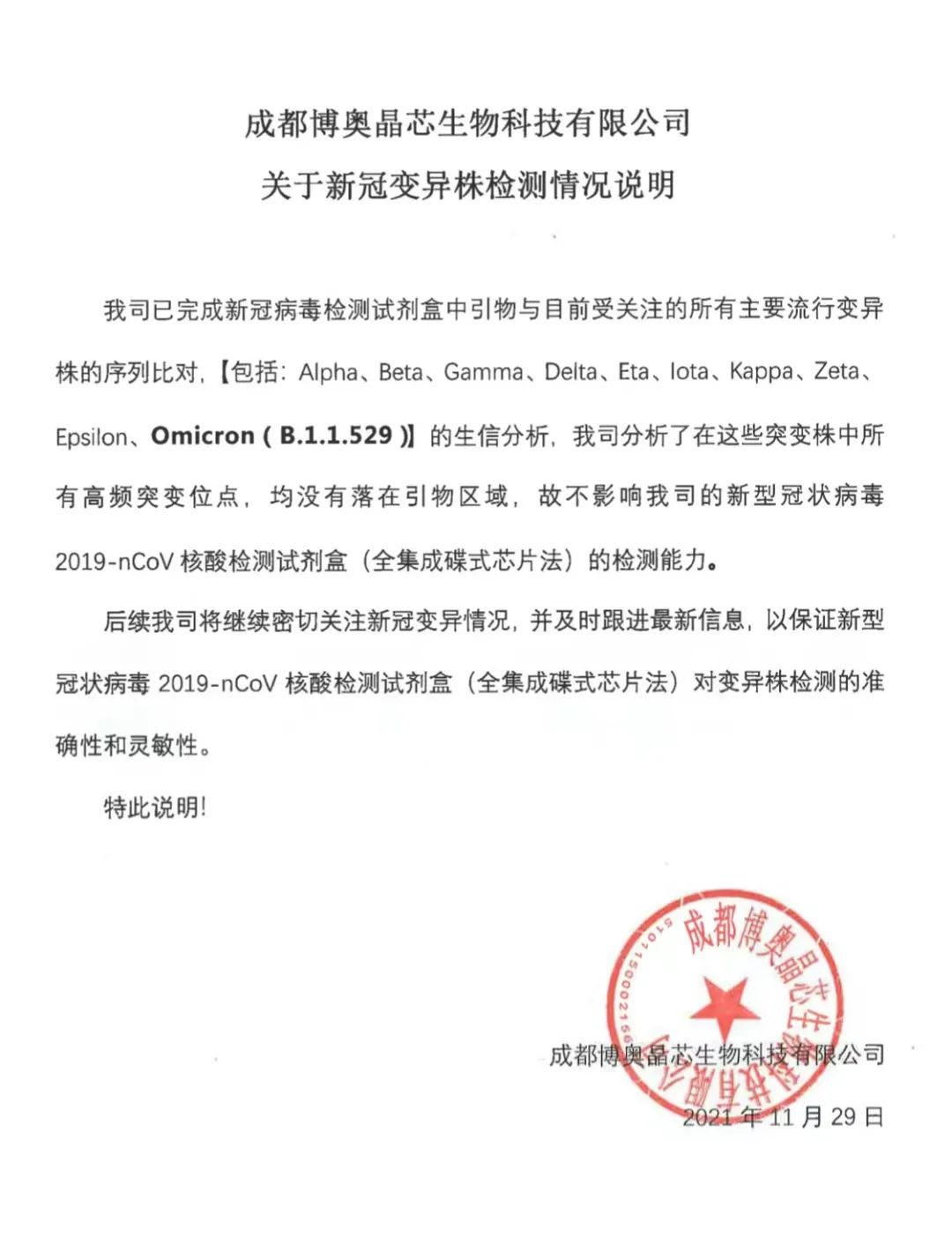目前,旗下成都博奧晶芯生物科技有限公司已完成新冠病毒檢測試劑盒中引物與目前主要流行變異株的序列比對【包括但不限于:Alpha、Beta、Gamma、Delta、Eta、Iota、Kappa、Zeta、Epsilon、Omicron(B.1.1.529)】,結果證實(shí):博奧已上市的新型冠狀病毒2019-nCoV核酸檢測試劑盒(全集成碟式芯片法),不會(huì )出現脫靶和漏檢的情況。后續,博奧將持續緊密追蹤全球新冠病毒變異株的最新動(dòng)態(tài)并及時(shí)跟進(jìn)最新信息,確保全集成新冠病毒核酸檢測芯片試劑盒對變異株檢測的準確性和靈敏性。