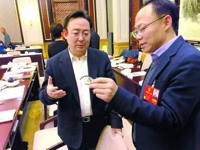 昨天,北京團小組會(huì )休息的間隙,程京代表(右)向夏林茂代表介紹基因芯片。張宇攝