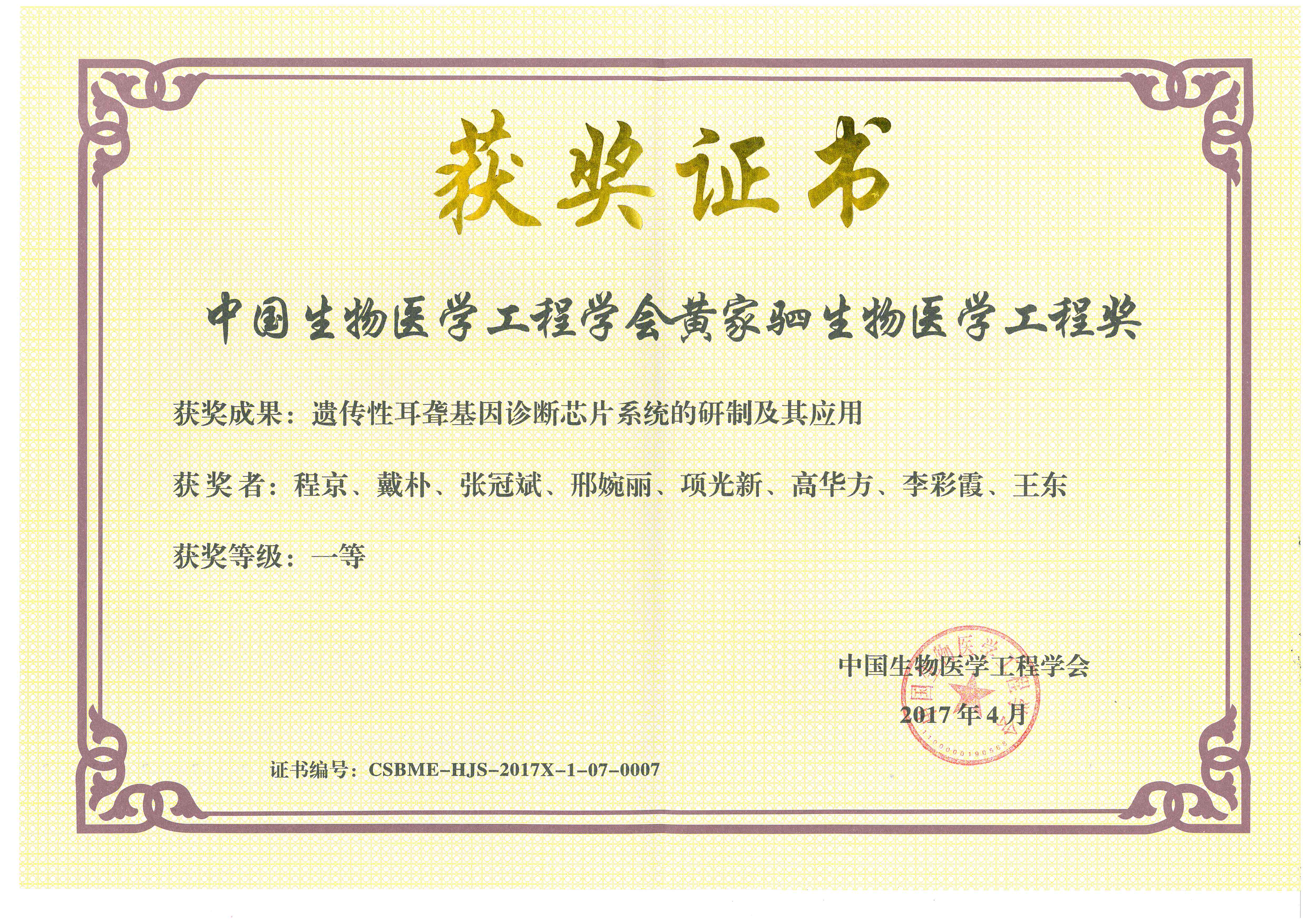 4月21日,2017年度“黃家駟生物醫學(xué)工程獎”頒獎儀式在北京會(huì )議中心舉行,博奧生物集團申報的“遺傳性耳聾基因診斷芯片系統”項目摘得技術(shù)發(fā)明類(lèi)一等獎,這是生物醫學(xué)和工程界對該項目的又一次極大肯定。中國醫學(xué)科學(xué)院院長(cháng)曹雪濤院士為該項目主導人——博奧生物總裁程京院士頒發(fā)了獲獎證書(shū)。