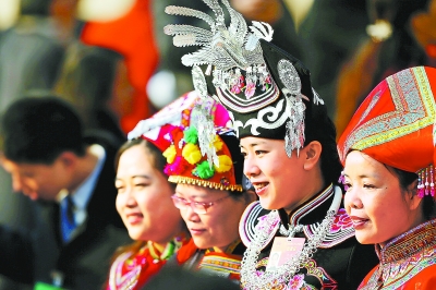 5日,第十二屆全國人民代表大會(huì )第三次會(huì )議在北京人民大會(huì )堂開(kāi)幕。圖為幾位盛裝參會(huì )的少數民族女代表。本報記者 戴冰攝?