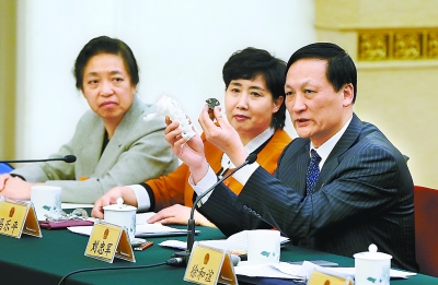在北京代表團向媒體開(kāi)放審議活動(dòng)中,人大代表、北京大學(xué)第三醫院骨科主任劉忠軍發(fā)言時(shí)拿出了一截3D打印人體脊椎骨,并以此為例向在場(chǎng)的代表闡述自己的觀(guān)點(diǎn),他認為,我國很多自己的科研成果因行政審批難導致走向市場(chǎng)困難,待審批批準后,國外同類(lèi)產(chǎn)品已經(jīng)大規模上市。本報記者 戴冰攝?
