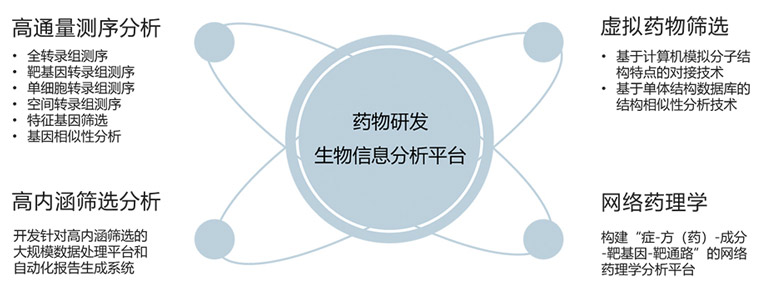 在新藥研發(fā)過(guò)程中,針對如何找到藥物作用靶點(diǎn),建立了以闡明“癥-方(藥)-成分-靶基因-靶通路”為目標的虛擬藥物篩選平臺和網(wǎng)絡(luò )藥理學(xué)分析平臺。包括基于計算機模擬分子結構特點(diǎn)的對接技術(shù)和基于中藥成分結構數據庫的結構相似性分析技術(shù),以及涵蓋了PPI蛋白互作關(guān)聯(lián)、轉錄因子調控、靶基因預測等多方面的網(wǎng)絡(luò )藥理學(xué)分析平臺。此外,整合包括全轉錄組、靶向轉錄組、單細胞轉錄組、空間轉錄組在內的不同轉錄組數據類(lèi)型,搭建高通量轉錄組測序自動(dòng)化分析平臺。