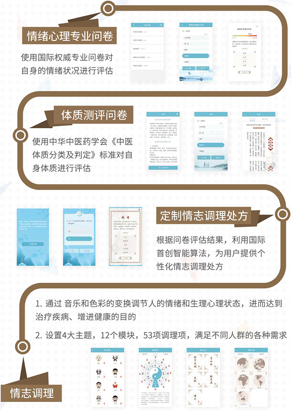(1)國際首創(chuàng )的融合藝術(shù)、人文、心理學(xué)、中醫、腦科學(xué)、多媒體等多學(xué)科的情志調理系統,并在慢性疾病非藥物治療領(lǐng)域開(kāi)展了有益探索。