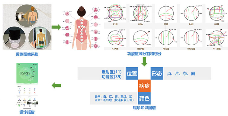罐診是中醫診斷的重要手段之一,是在人體背部督脈、膀胱經(jīng)上的反應點(diǎn)選取相應的功能反應區扣拔11罐,扣拔五分鐘后起罐形成的罐象結合中醫學(xué)說(shuō)的寒熱虛實(shí)等來(lái)判斷人體五臟六腑的功能狀態(tài)?;诓W生物集團有限公司開(kāi)發(fā)的罐診儀,研究院開(kāi)發(fā)了基于人工智能的罐診信息系統。該系統通過(guò)罐象反射區和功能區圖像分割,根據各區域的形態(tài)和顏色特征,自動(dòng)識別健康狀態(tài)和易患病癥,并形成罐診報告。